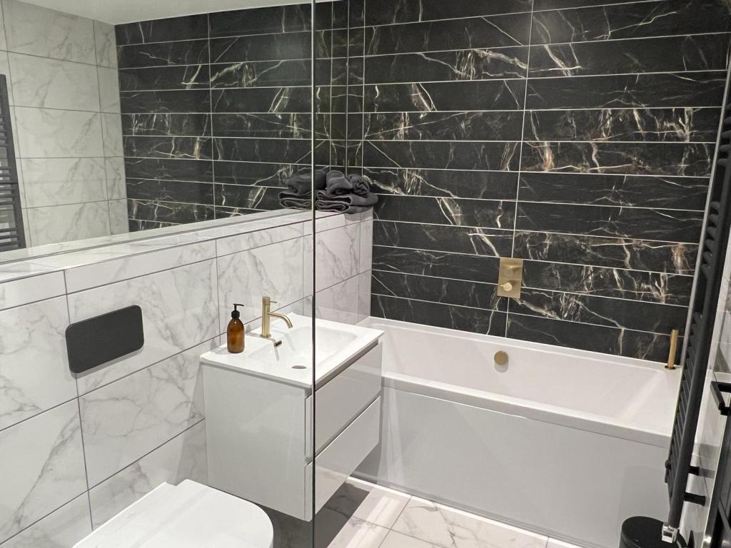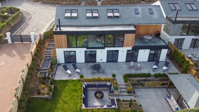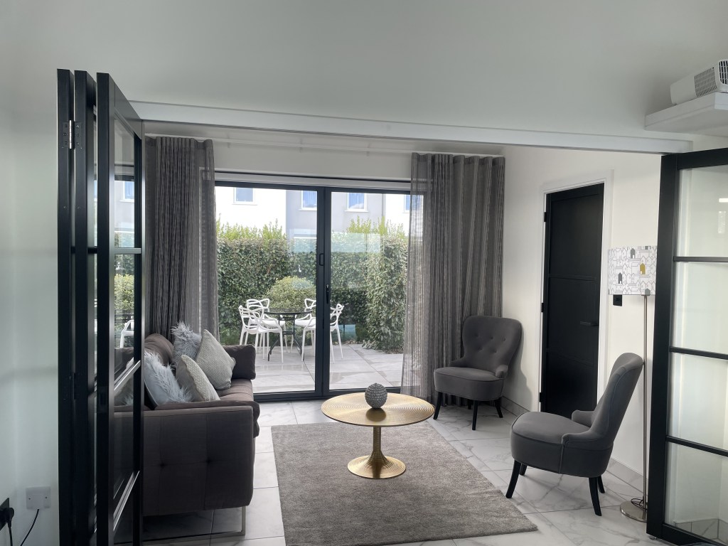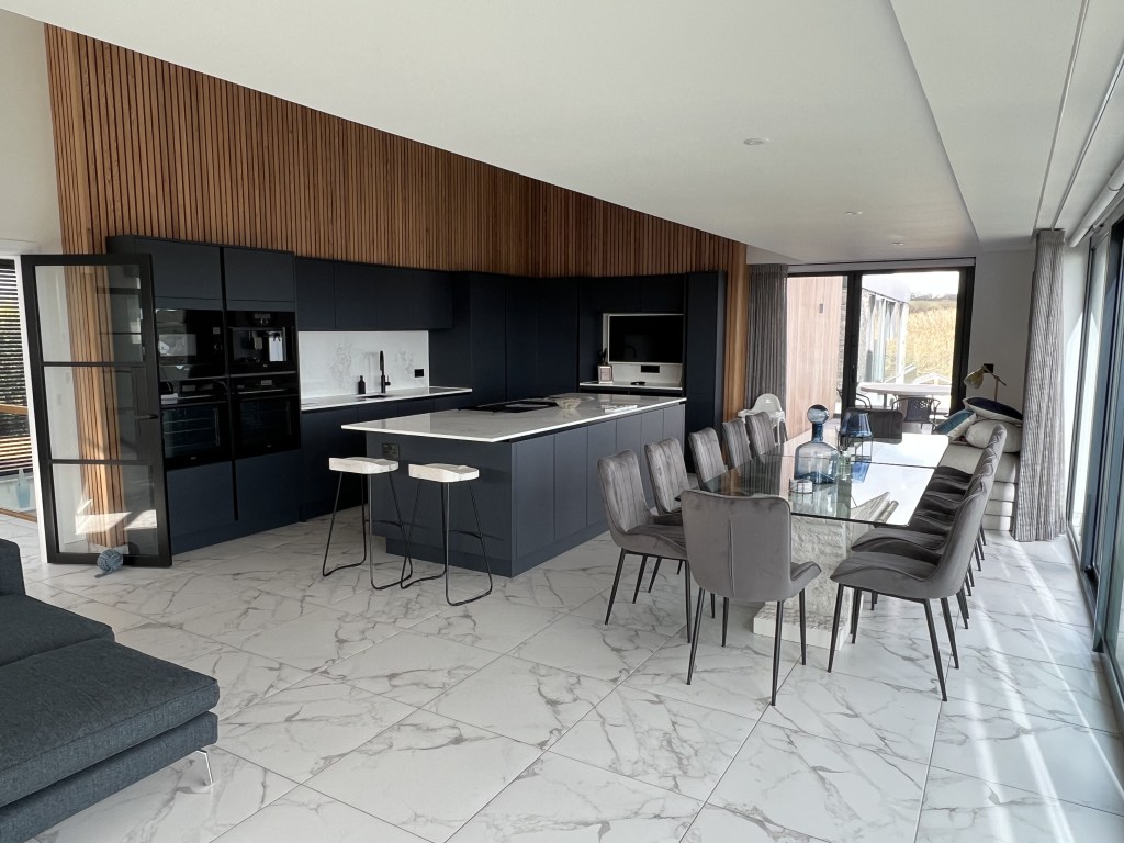 The first-floor kitchen and dining area at Seabreeze foster a warm and social atmosphere, featuring bi-fold doors that lead to a sun-soaked balcony. Equipped with a spacious kitchen island, integrated ovens (2), microwave, coffee machine, and dishwasher, along with bar seating and a dining table, it’s the perfect space to create memorable holiday meals and enjoy reconnecting with friends over glasses of wine.